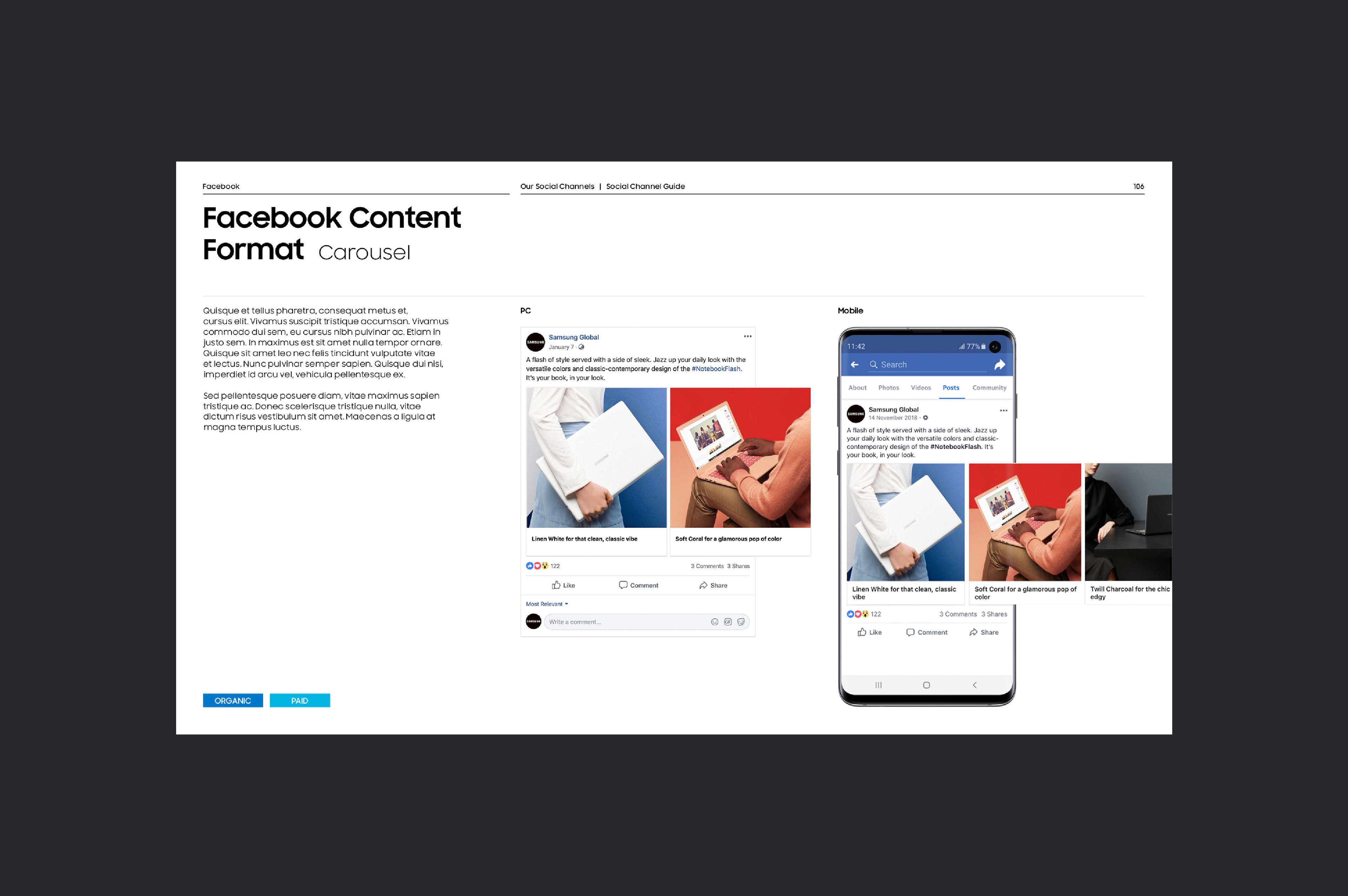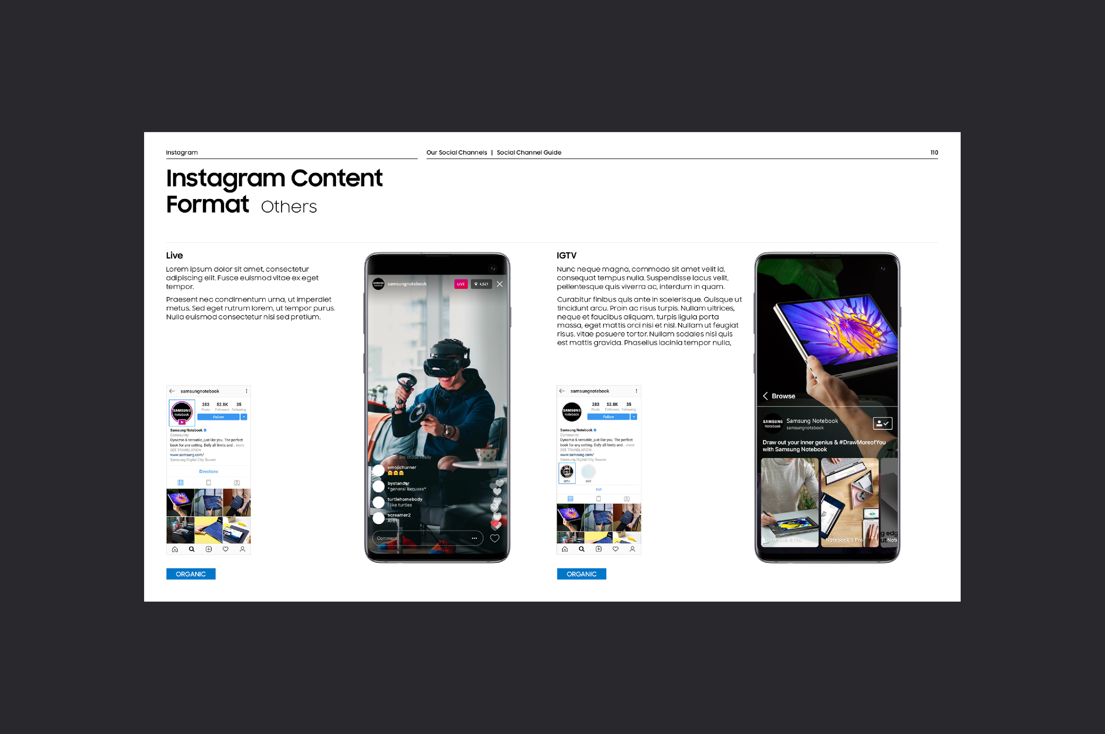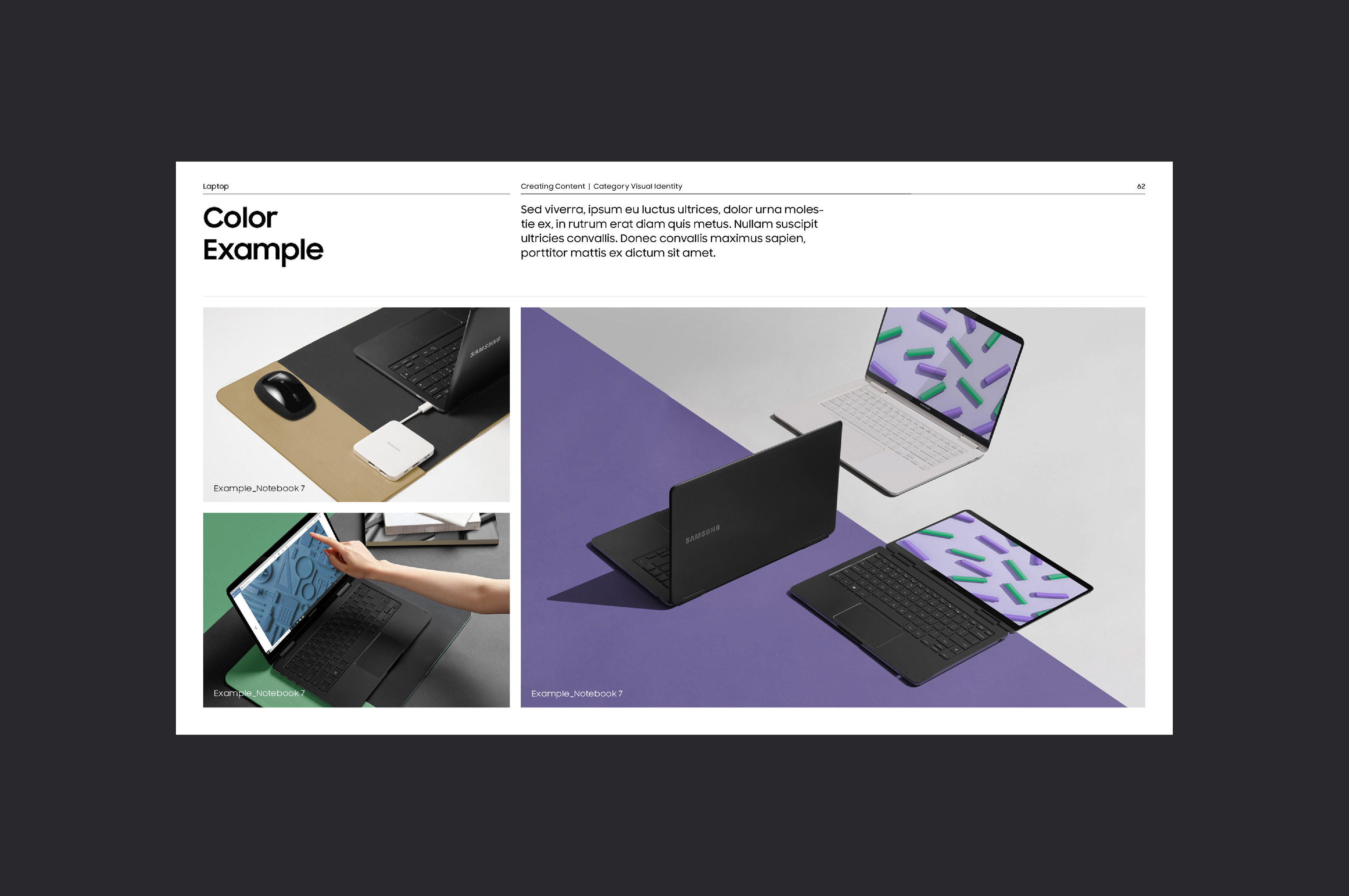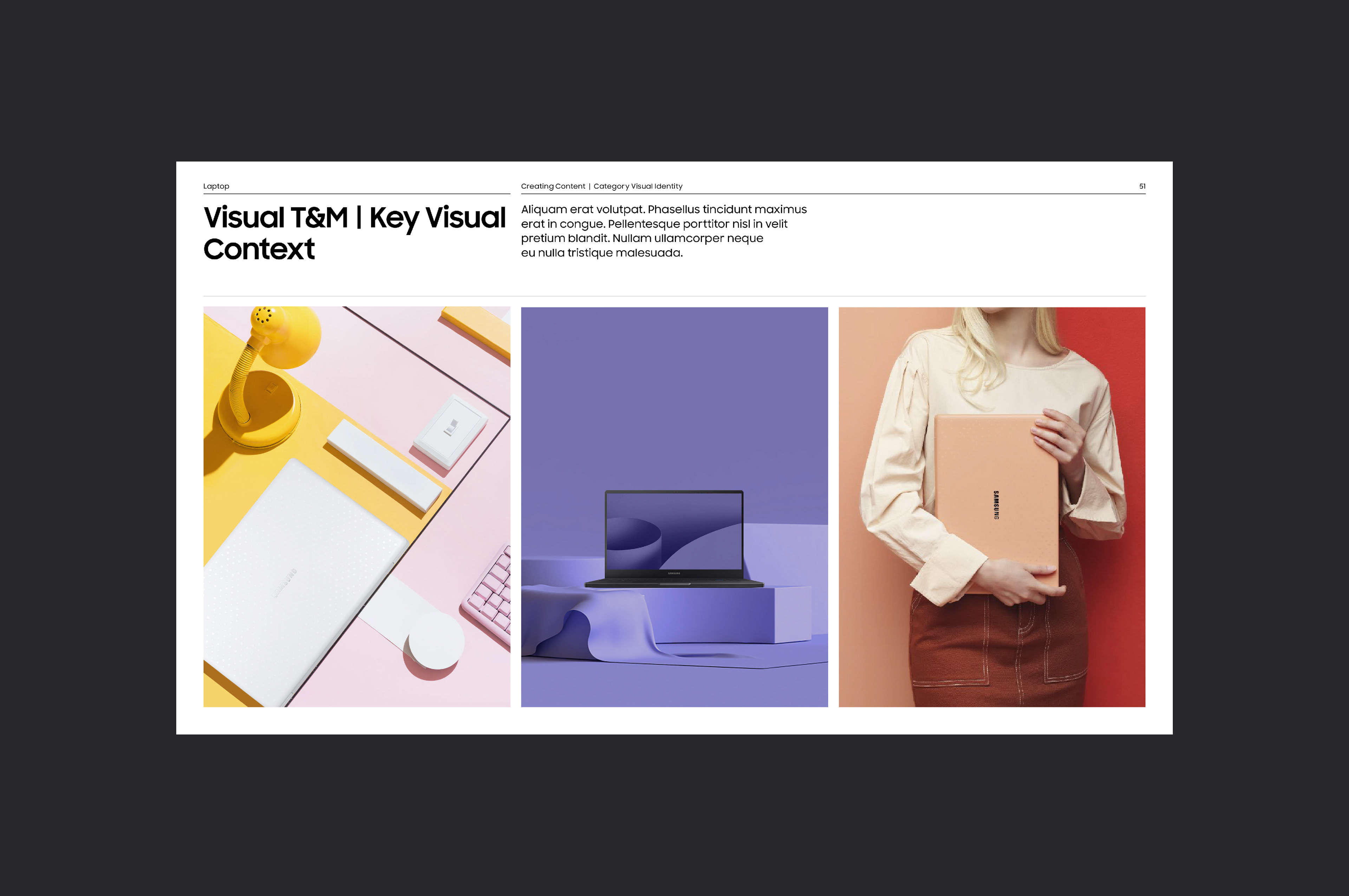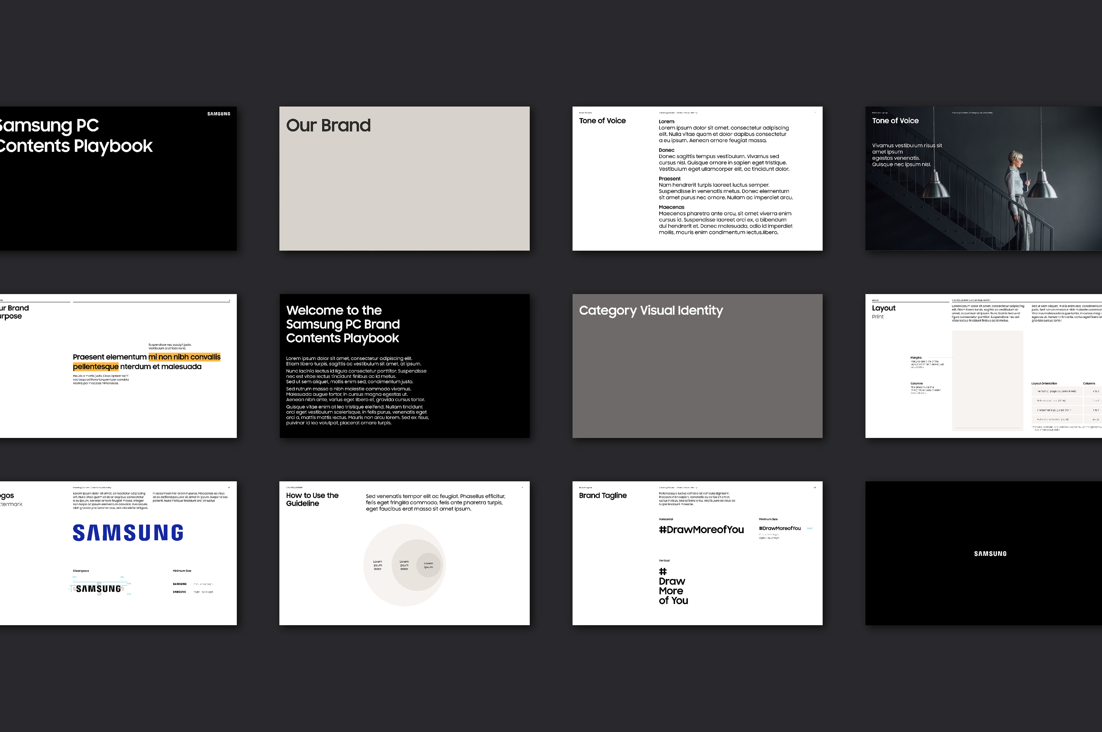 We developed guidelines on communicating with consumers for Samsung’s 4 laptop PC brands: Premium Laptop, Laptop, Gaming, and Chromebook. By setting the tone and mood of each brand, we came up with guidelines on the ideal use of communication content. Those guidelines form the basis of the linguistic and visual system through which Samsung’s different laptop PC brands communicate in the consumer’s language and appeals to their individuality.