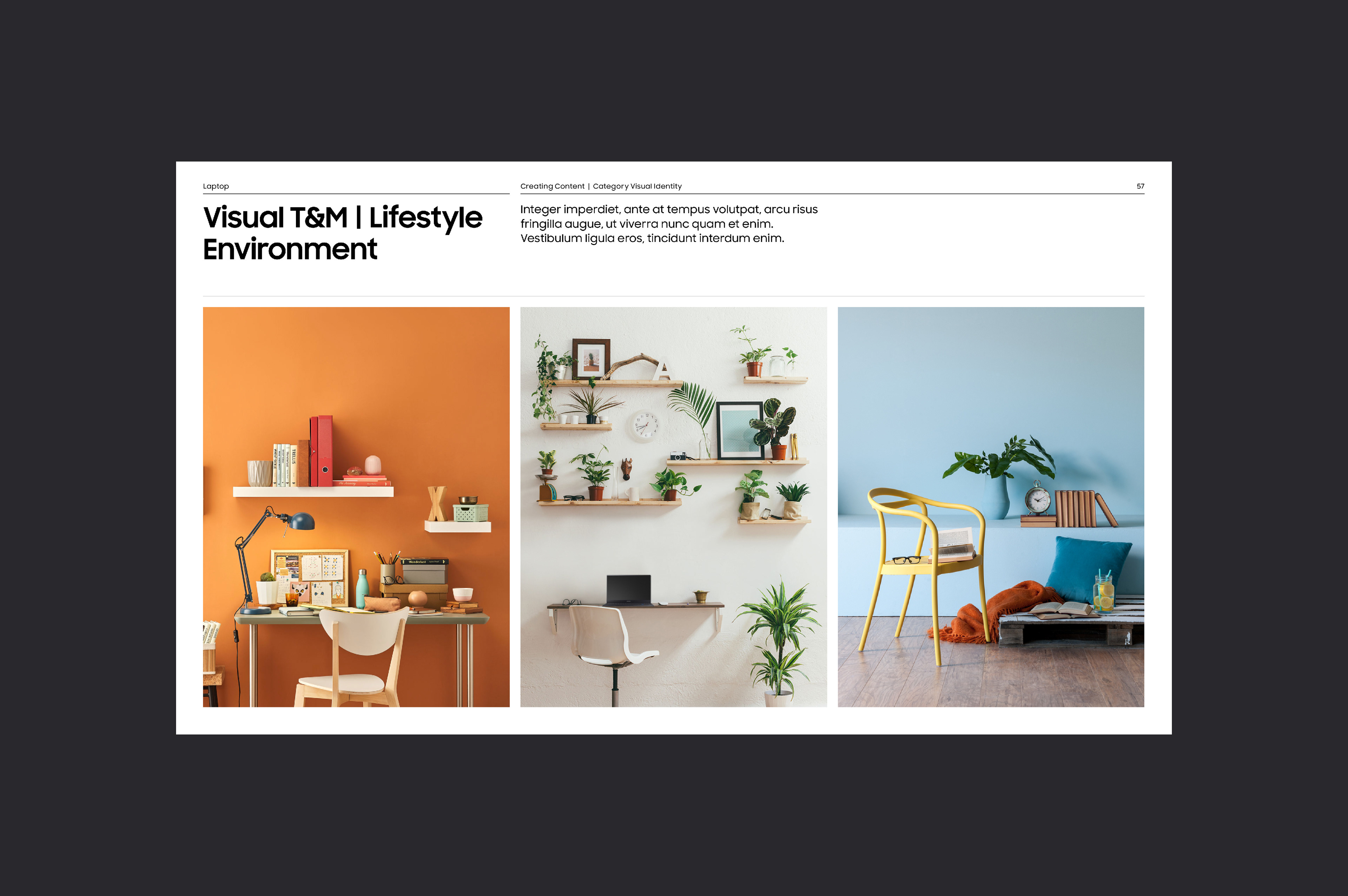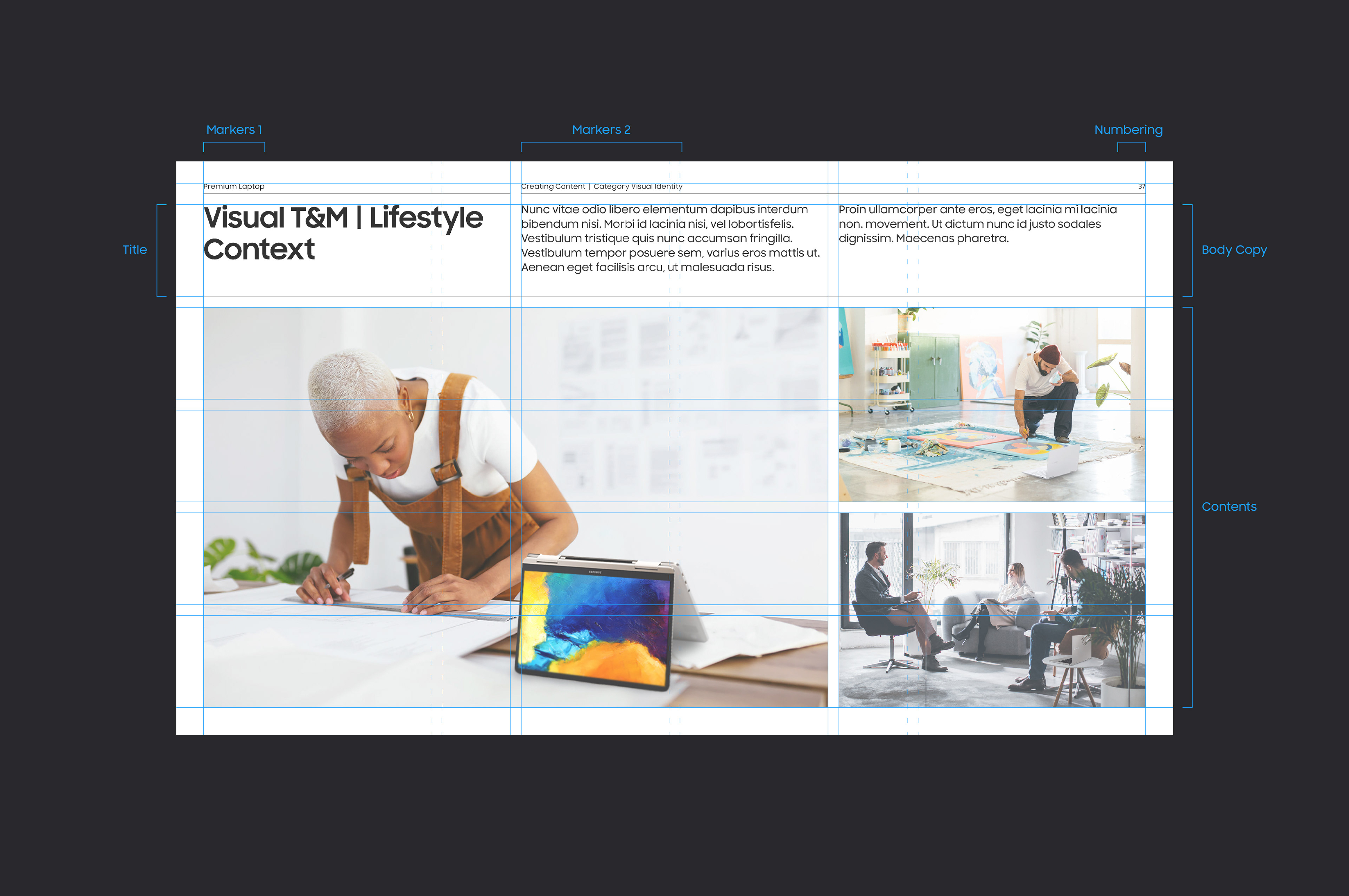 삼성은 4가지 PC 브랜드의 타겟 고객별 최적의 커뮤니케이션 전개를 위한 이미지와 tone of voice 등의 대고객 커뮤니케이션 컨텐츠 가이드라인이 필요했습니다. 베이그는 4가지 브랜드별 타겟 그룹이 선호하는 T&M를 설정하고, 그에 적합한 컨텐츠와 이미지 사용 규정을 정립하였습니다. 삼성의 다양한 PC 브랜드가 각각의 타겟 고객의 언어와 감각으로 소통하고, 고객이 추구하는 스타일과 개성을 충족할 수 있도록 이미지와 무드를 분류하고 구분하여 각 브랜드의 언어적, 시각적 체계를 구축하였습니다.