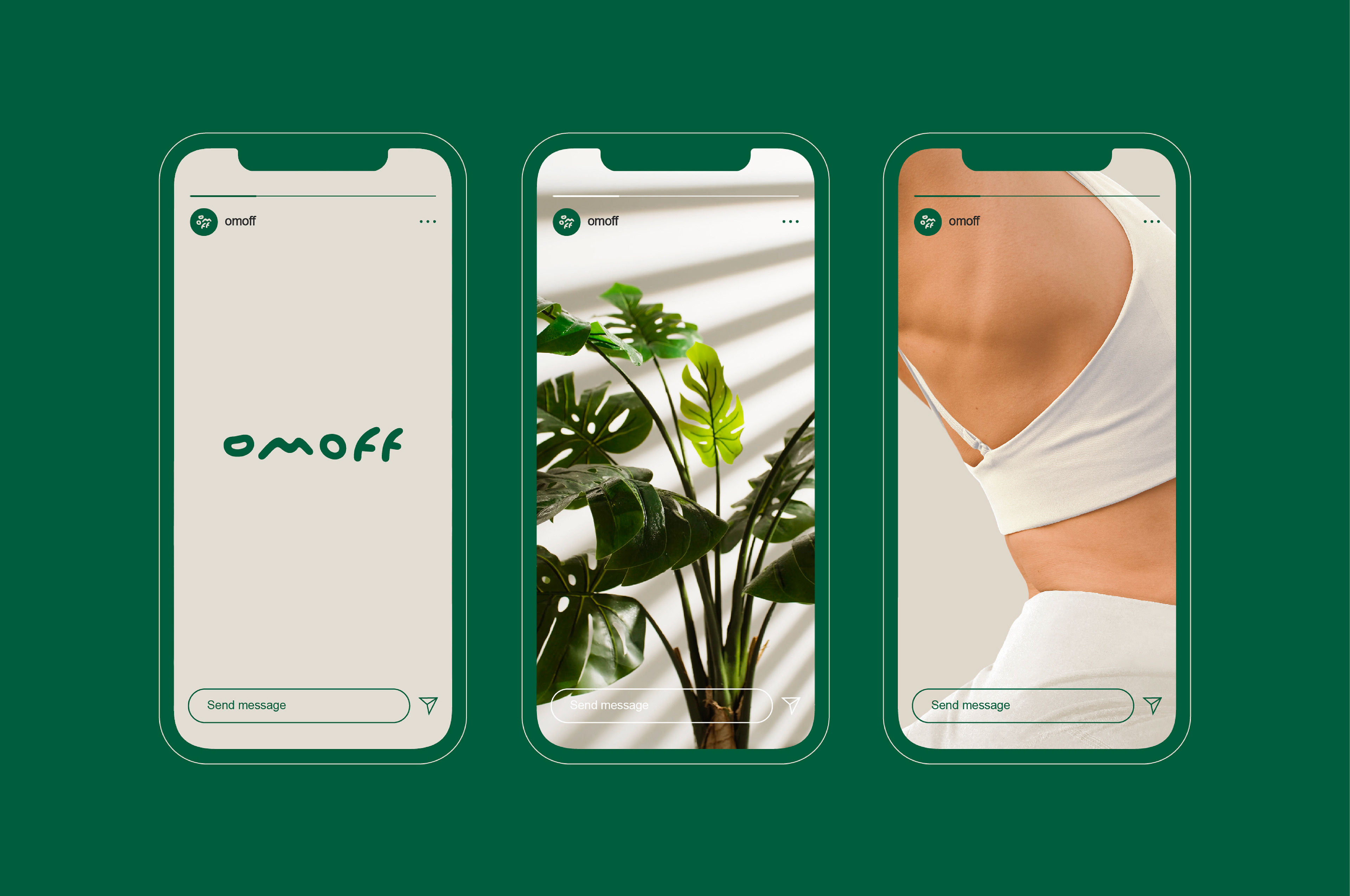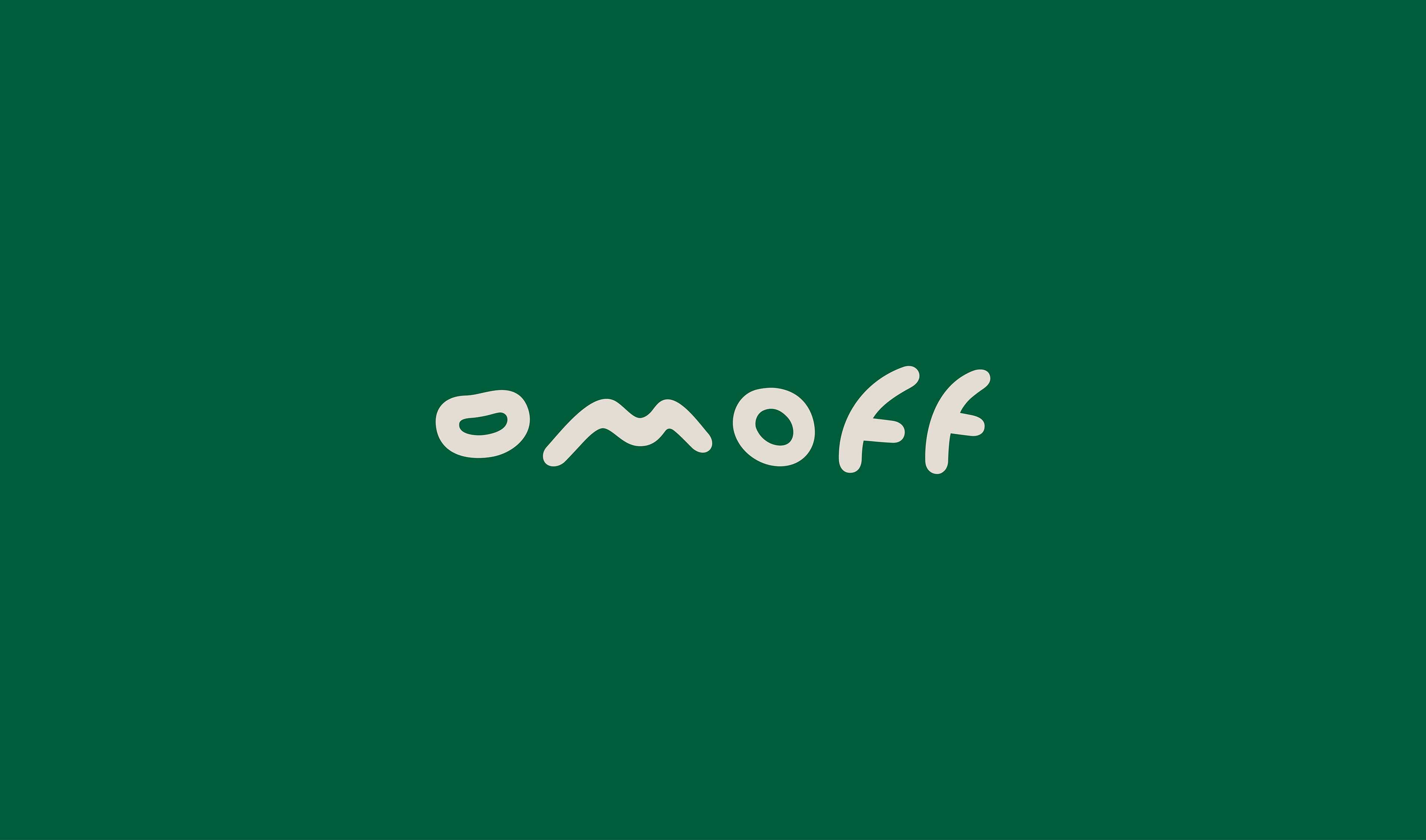 자유롭게 드로잉한 서체로 디자인된 옴오프의 로고타입은 부드럽고 유기적인 형태를 통해 지속 가능한 행복을 추구하는 옴오프의 브랜드 가치를 담아냅니다. 또한 옴오프 그린과 옴오프 베이지를 메인 컬러로 선정하여 자연친화적이고 건강한 삶의 가치를 전달하는 브랜드의 이미지를 강화하였습니다. 경쾌하고 리듬감 있는 조형과 쉽고 재밌는, 밝은 무드를 통해 지금의 순간을 즐기는 자유로운 브랜드 정신을 표현하였습니다.