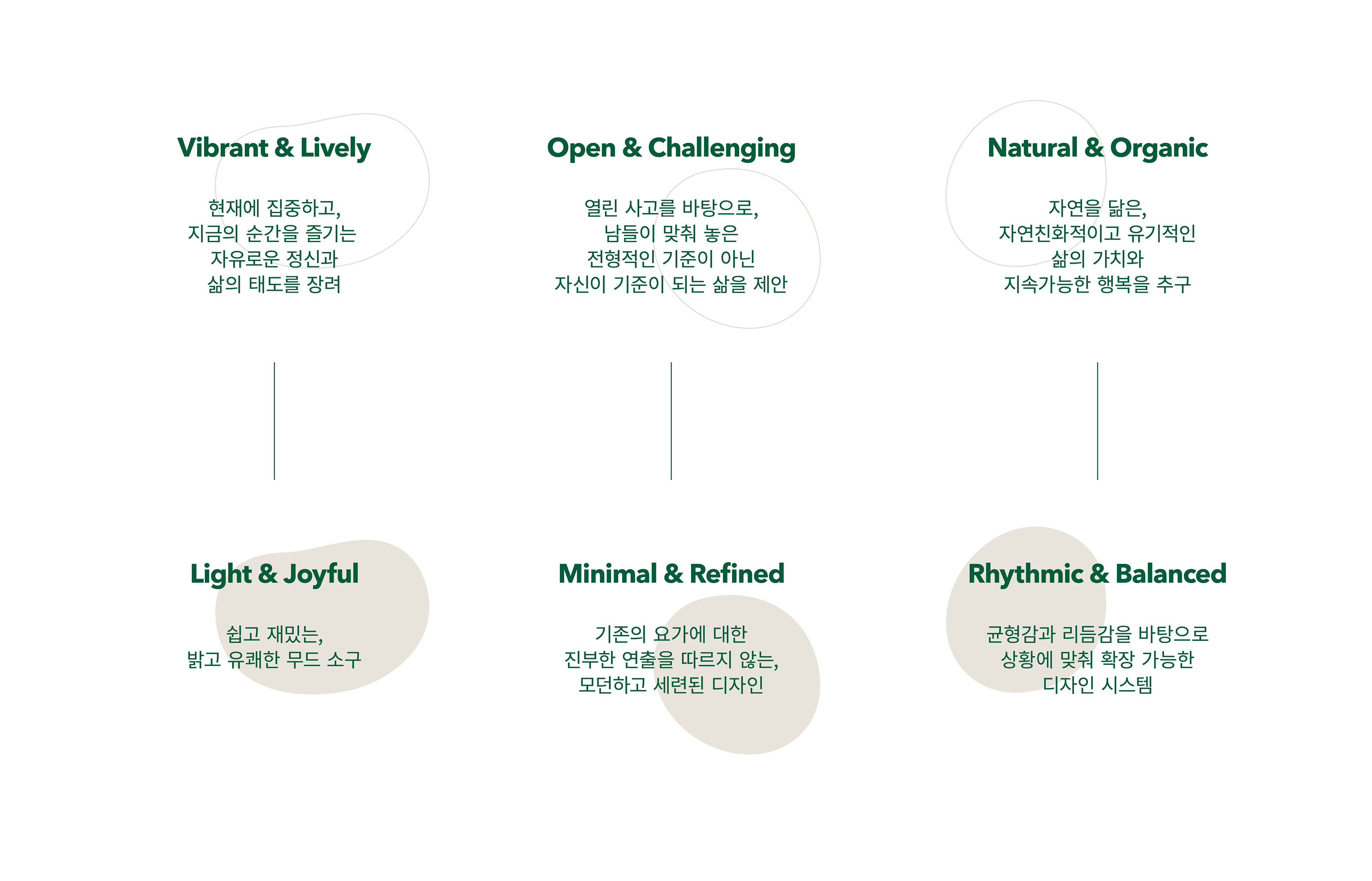OMOFF, a brand created by combining ‘OM,’ symbolizing the beginning of yoga, and ‘OFF,’ representing life beyond the yoga mat, is a lifestyle brand that spreads the positive energy of yoga into everyday life. We has derived three core values - a free spirit focusing on the present, the intrinsic worth of a life defined by oneself, and the pursuit of sustainable happiness through a nature-friendly lifestyle - and reflected these in the brand identity.