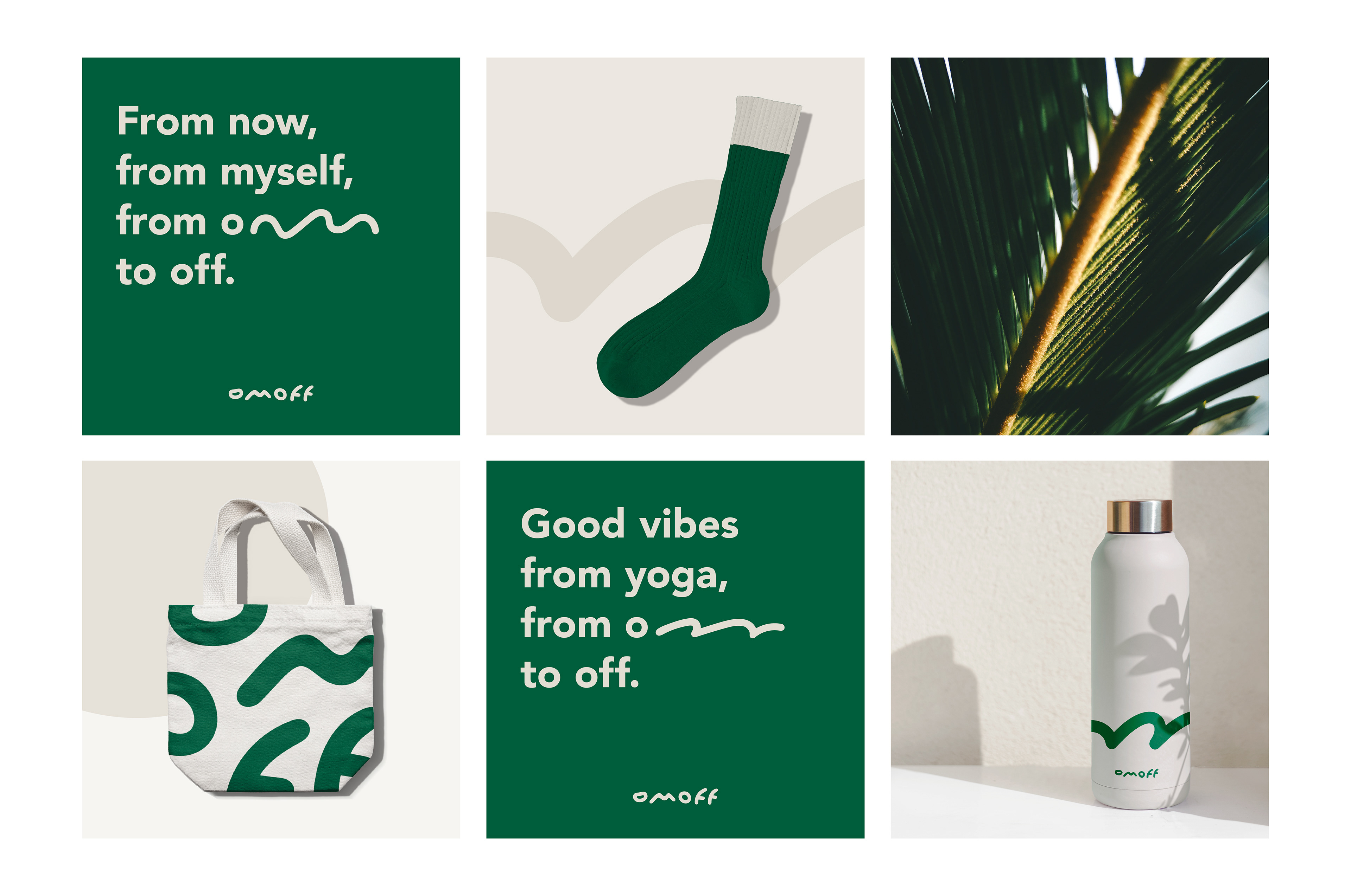 옴오프는 요가의 시작을 뜻하는 ‘OM’과 요가 매트를 벗어난 일상을 의미하는 ‘OFF’가 합쳐져 만들어진 이름으로, 일상속에 요가의 좋은 기운을 전하는 라이프스타일 브랜드입니다. ‘현재에 집중하고 지금의 순간을 즐기는 자유로운 정신’과 ‘스스로가 기준이 되는 삶의 가치’, ‘자연친화적이고 유기적인 삶을 통한 지속가능한 행복 추구’라는 세 가지 핵심 가치를 도출하여 이를 반영한 브랜드 아이덴티티를 개발하였습니다.