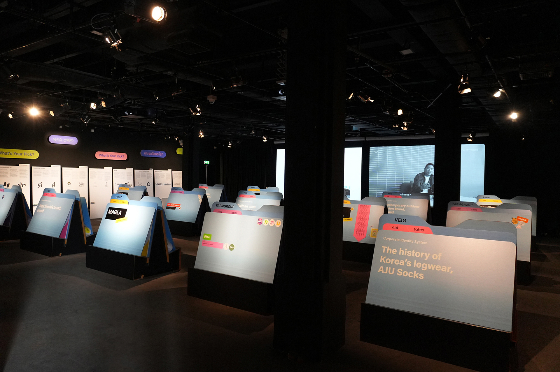 각 프로젝트는 A컷과 B컷을 담은 '폴더'의 형태로 전시되었습니다. 전시장에 나란히 정렬된 폴더들은 온라인 전시의 컨셉과 비주얼 아이덴티티를 물리적 공간에 그대로 구현한 결과물입니다. 우리는 관객이 전시장에 들어서는 순간, 모니터 속에서 보아오던 익숙한 디지털 폴더를 실물로 마주하는 특별한 경험을 선사하고자 했습니다. 특히 온라인 전시를 먼저 접한 관객들에게는 온·오프라인의 완벽한 일관성이 주는 시각적 즐거움이 전달되길 바랐습니다. 총 30개의 폴더는 회사명과 프로젝트 타이틀로 네이밍되어 문서를 분류하듯 배치했습니다. 폴더 커버를 열면 최종 선택된 A-cut과 아쉽게 채택되지 못한 B-cut이 두 개의 탭으로 분류되어 있으며, 관객은 페이지를 넘기며 초기 아이디어와 스케치부터 최종 디자인에 이르는 전 과정을 한눈에 확인할 수 있도록 했습니다. 이 폴더의 형태, 구조 및 배치는 PBB&O와 ZGP, Kozo Stdio, OHIO의 협력과 지원으로 완성되었습니다.