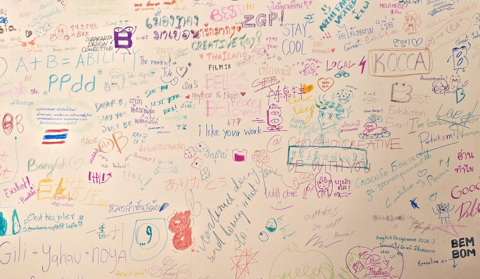 The response was overwhelming. The guestbook wall quickly filled with messages in Korean, English, and Thai, alongside witty and creative illustrations. We were deeply moved to see visitors passionately filling every inch of the main wall and even spilling over onto the side panels. We sincerely thank everyone for the incredible love and energy they contributed to this shared journey.