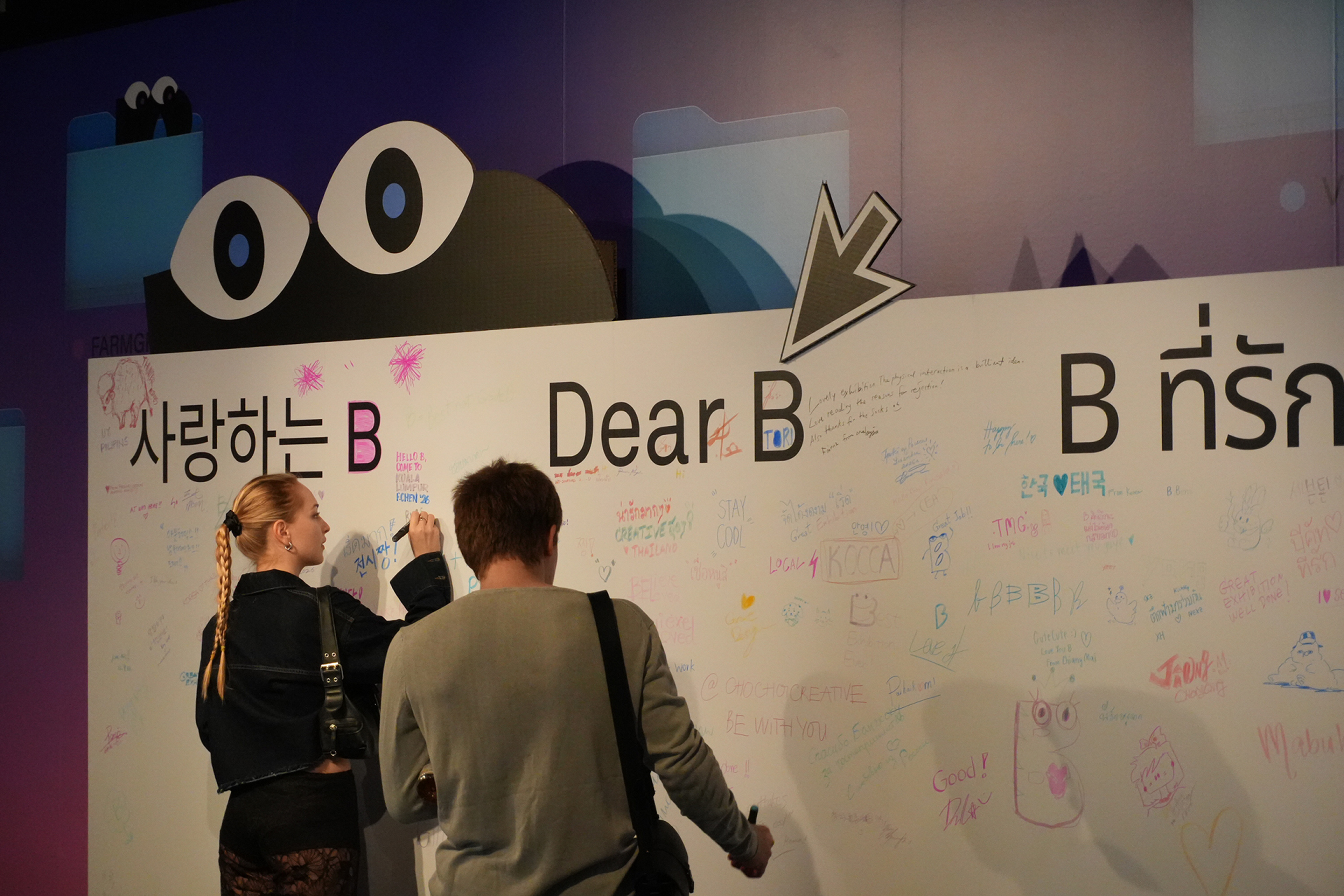 전시장 동선의 마지막에는 전시 관람 후기를 자유롭게 남길 수 있는 방명록 겸 포토존이 마련되었습니다. 특히 개성 넘치는 네 마리의 B 캐릭터와 함께 사진을 찍으며, 관람객들이 이번 전시의 기억을 오래도록 간직하기를 바라는 마음을 담았습니다.