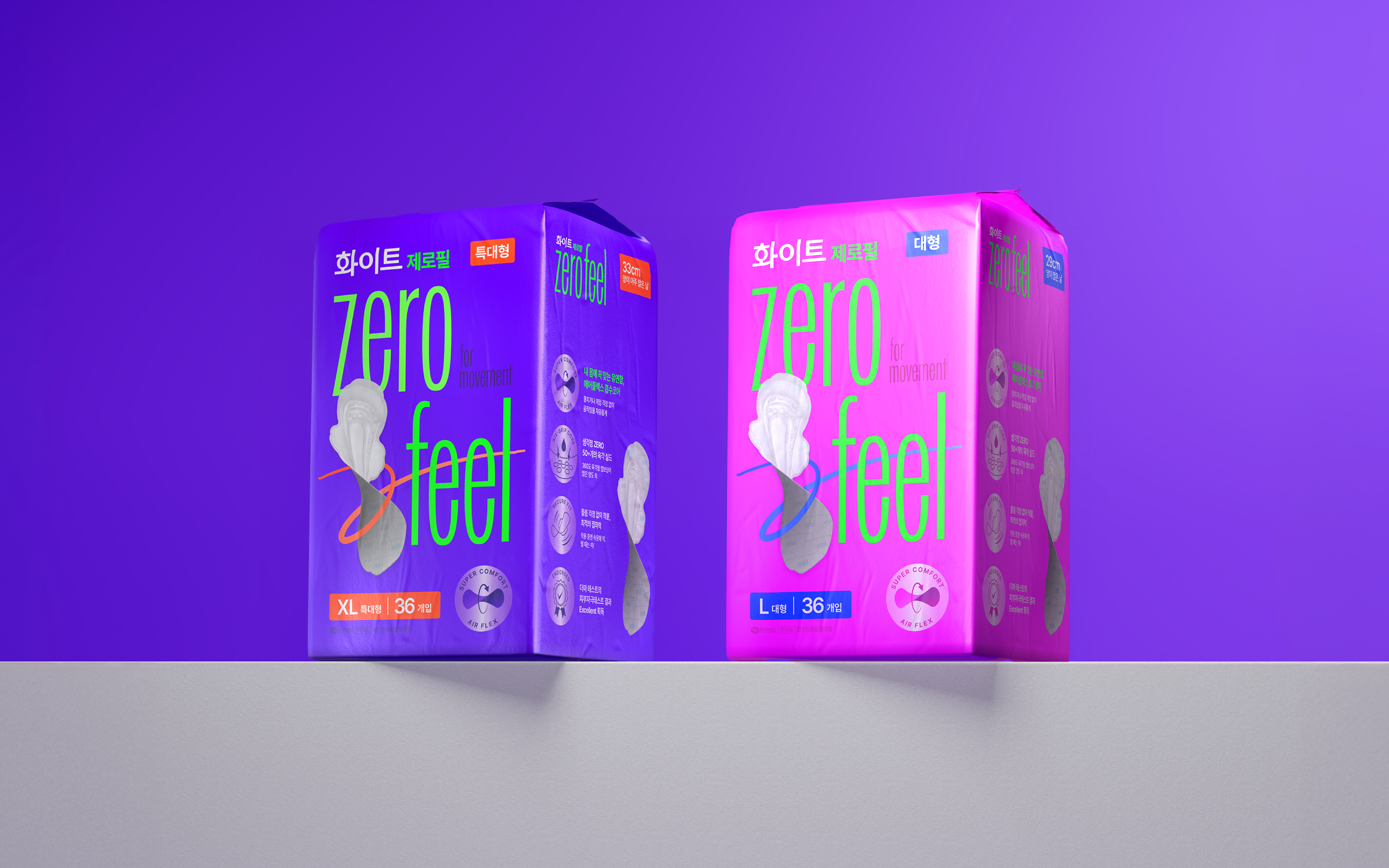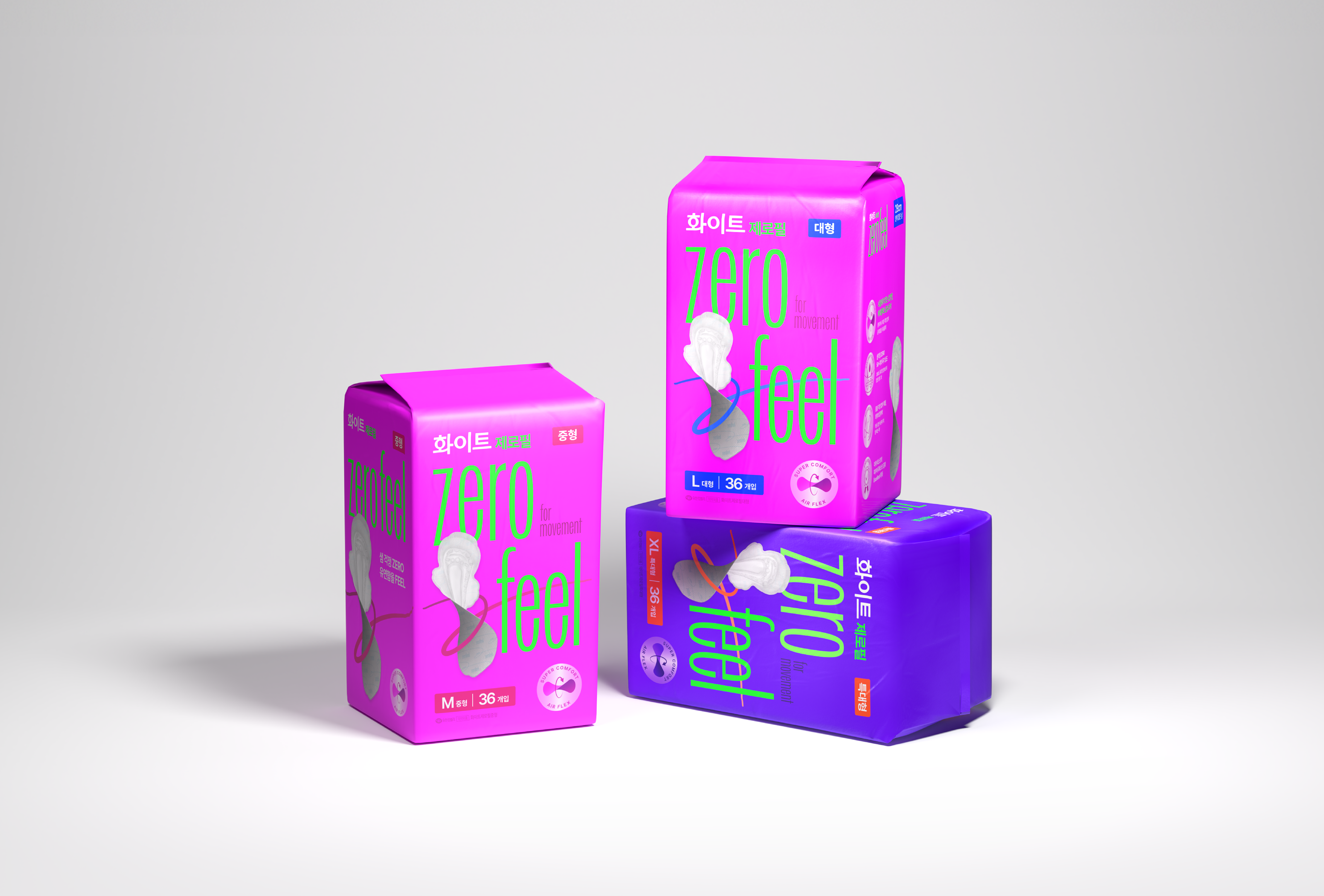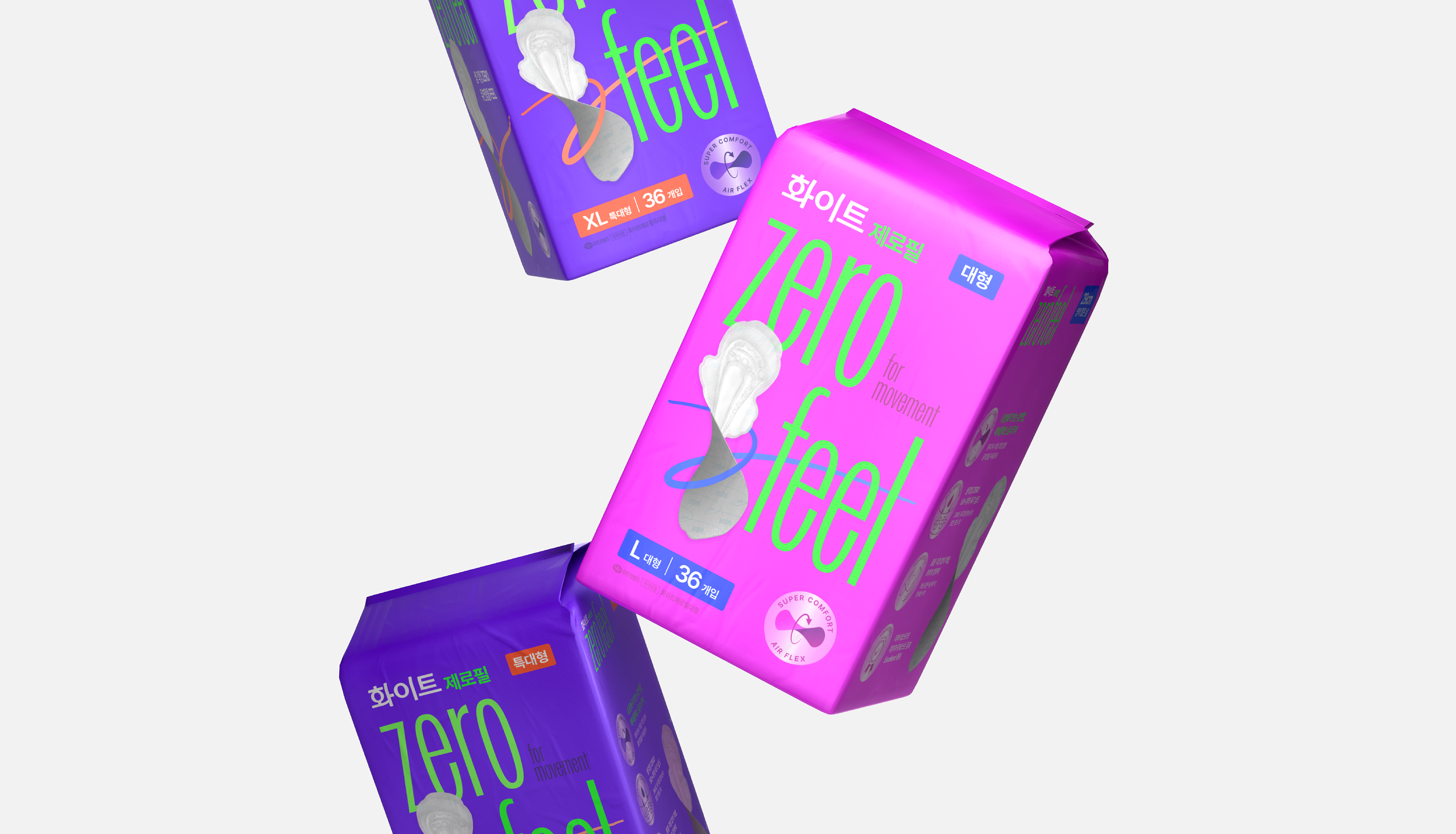 To intuitively convey ZERO FEEL’s core value of ‘light and flexible comfort’, we placed the softly lifted product image at the forefront, complemented by a dynamic line motif, intuitive icons, and a confident wordmark. This composition captures attention at first glance, delivering a powerful and differentiated presence on the shelf. Furthermore, by maintaining structural consistency with WHITE’s existing brand assets, we built a scalable packaging system that can flexibly respond to future line extensions. Through this approach, ZERO FEEL establishes itself as a premium line that embodies both contemporary sensitivity and trusted credibility, crafted to move a new generation.