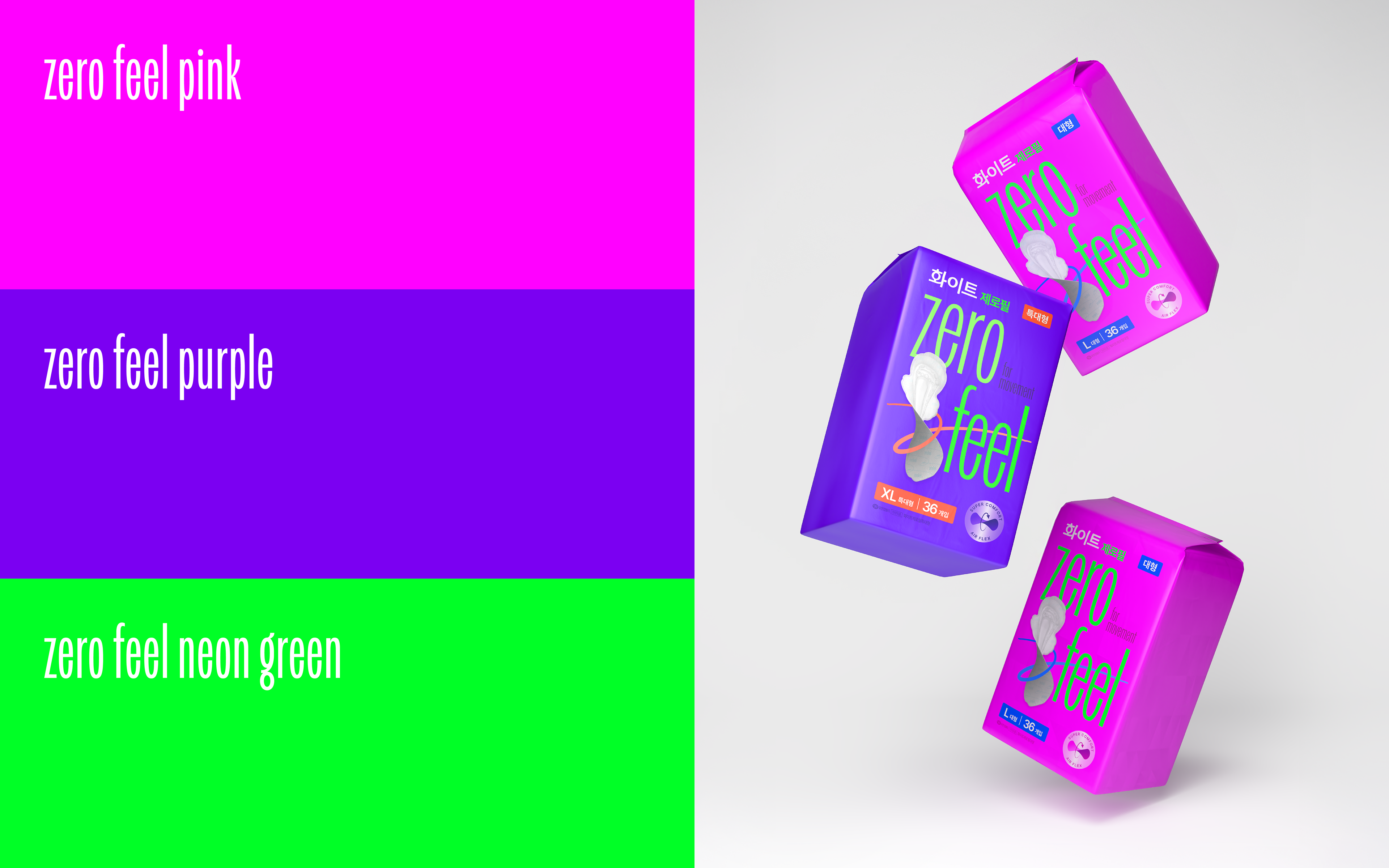 Rooted in the needs of modern women who seek to stay bright, confident, and uninterrupted throughout their day, we defined the concept “Light Moves, Bold Feels.” To visualize the sense of lightness and refined sensitivity, we developed a condensed, lightweight wordmark, vivid high-chroma colors, and dynamic linear motifs that express ZERO FEEL’s performance and the emotional rhythm of a new generation.