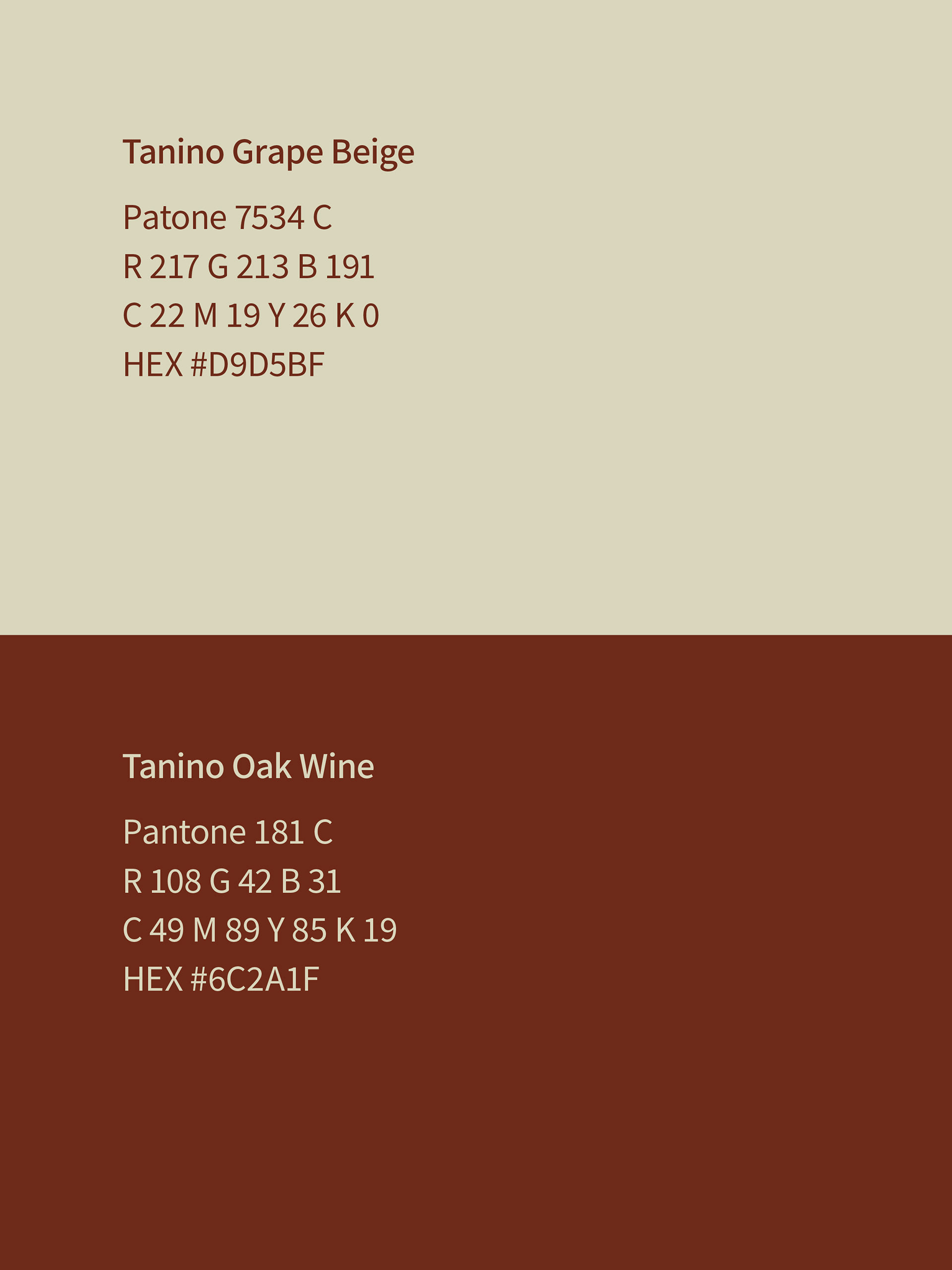 와인은 그 종류에 따라 다양한 포도 품종으로 만들어집니다. Tanino Grape Beige는 진정한 포도색은 품종에 따라 서로 다른 껍질의 색이 아니라 그 속에 든 포도알의 색이라는 생각에서 출발한 컬러입니다. 그린 빛이 가미된 차분한 아이보리톤의 Tanino Grape Beige는 타니노의 진정성과 오리지널리티를 소구합니다. 타니노의 두 번째 컬러, Tanino Oak Wine은 와인 숙성에 없어서는 안 될 오크통을 연상시키는 깊고 풍부한 감성을 담았습니다. 레드 빛이 감도는 브라운의 컬러로 오크통안에서 숙성되면서 그 향과 풍미가 더욱 깊고 그윽해진 칠레 와인을 상징합니다.